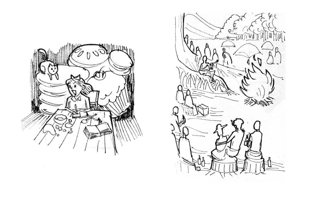 This lesson became hardwired for me in 2015 during the final assignment of a Concept Art course. After my thumbnails were approved by the instructors (we had to create five scenes for a short story), I had to work on the larger-scale versions. When I did, I made the mistake of redrawing each scene from scratch, “eye-copying” the approved thumbnails. When I presented the first three pieces to the instructor, he pointed out that some of the original magic had been lost. What was the reason? I added lines and details where there hadn’t been any before, which muddied the negative spaces and made them harder to read. He then advised me to trace my own thumbnails instead, to maintain the clarity of the elements I had already solved.