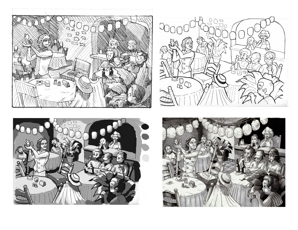 Many of us know by now that the quickest way to achieve something challenging is through failure, but more than that, understanding why we fail is the doorway to success. This is something working on thumbnails allows me to do. A quick sketch for a composition takes me about 1 or 5 minutes, and by then, I can tell if it’s heading in a good direction or if I need to explore another option. I can fill an entire letter-size page with six thumbnails in 15 minutes, and I know for sure that my final work comes from those explorations. On rare occasions, when inspiration strikes, I might solve it in the first or second sketch. But I don’t take those lucky moments too seriously—whether it takes 5 minutes or more per sketch, what’s important is learning whether your idea works or not before putting great effort and time into it.