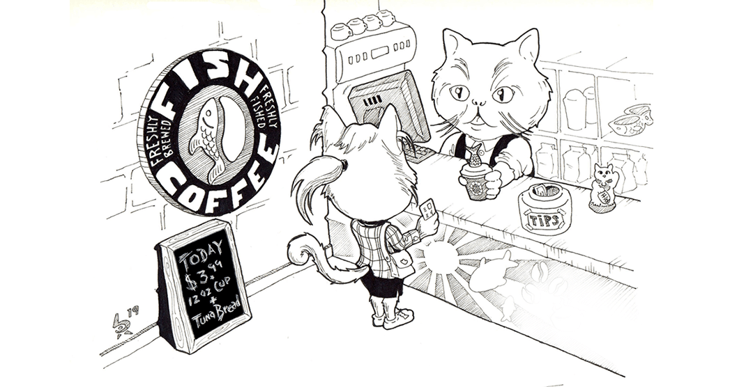 “Otro día más en el Fish Coffee del centro comercial”, este arte concepto es otra de las ideas a partir de combinar dos palabras aleatorias. #fishcoffee #coffee #cats #conceptart #inkdrawing