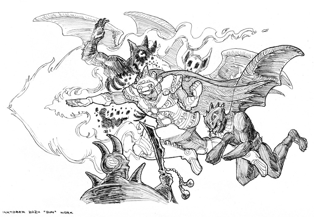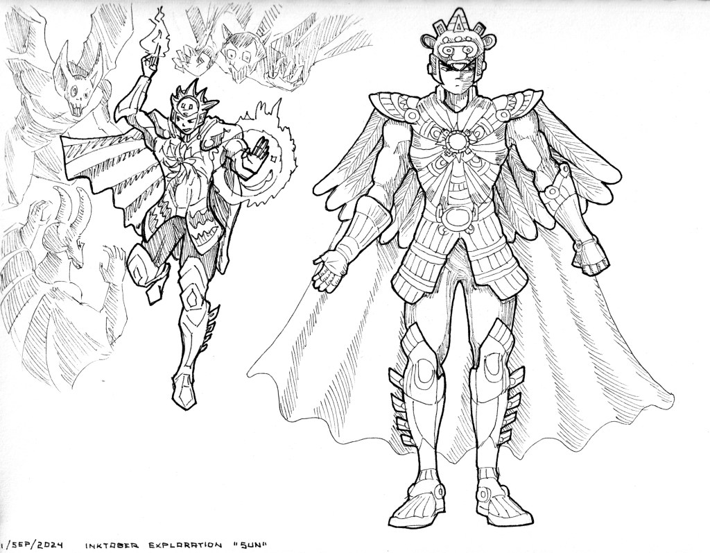 This is one that took me longer and more iterations to complete. This was the initial thumbnail sketch (I also made the character design, for the armor in particular)