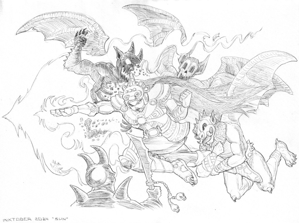Tonatiuh, the ancient Aztecs’ representation of the Sun god, makes his way through the forces of the night.