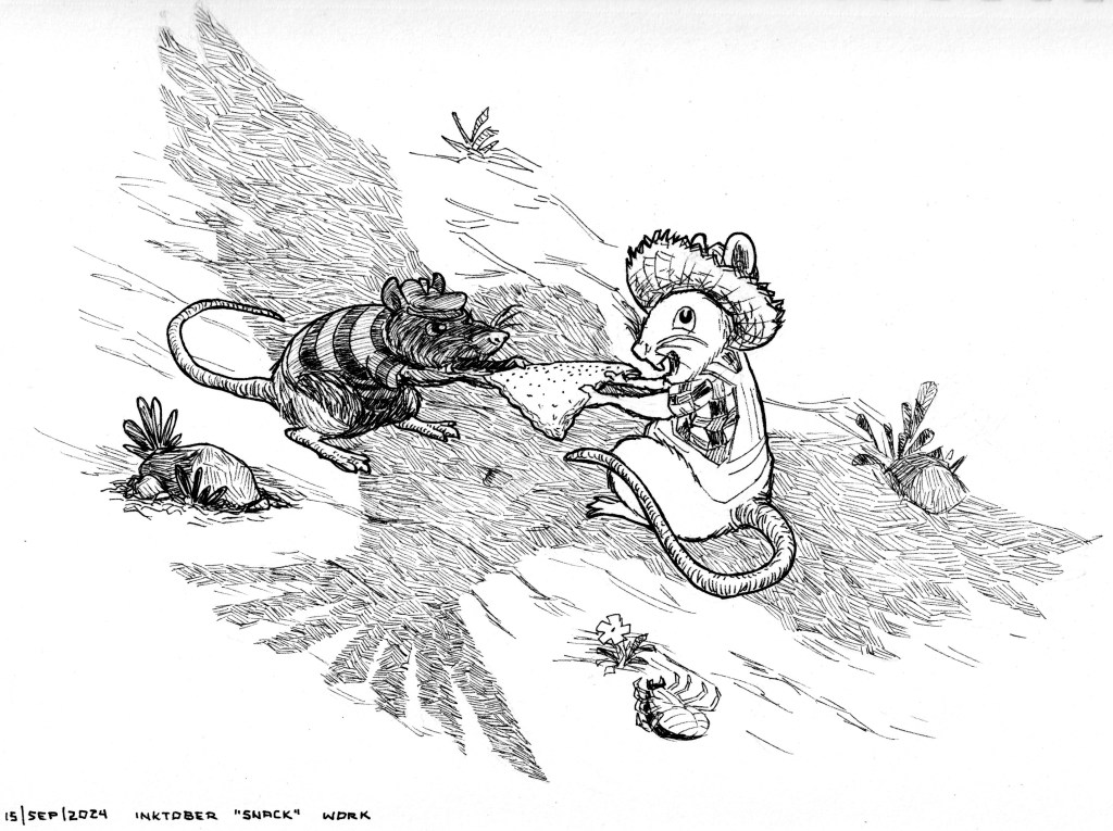 Then, I decided to add a differentiator to the mice, as I imagined what could be tha nature of their conflict, besided the obvious. One was a countryside mouse, while the other one a urban. But this time, I decided that only the country-side one was aware of the danger.