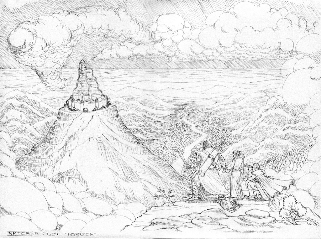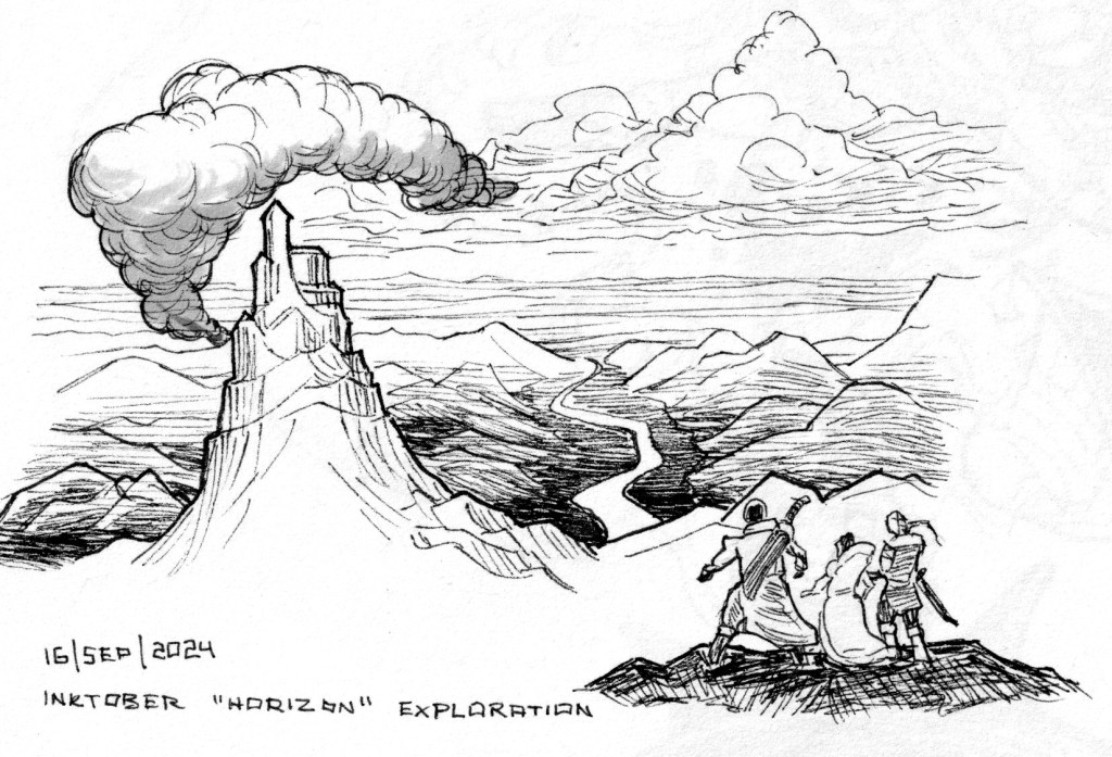 This scene was originally conceived for the prompt word “BEAST” of last year’s Inktober, where three original characters were going on a quest to hunt a supernatural beast. Back in that year, I was writing a short story for each prompt-word, and this was probably the most ambitious of them in such a way that I couldn’t finish neither the story nor the illustration. But now it’s here.