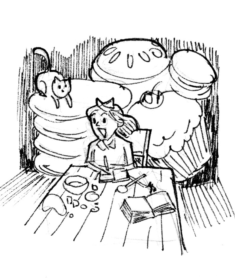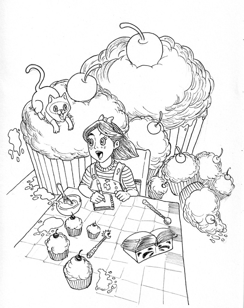 This is the working sketch, where I added a few more things and decided all the treats would be cupcakes.