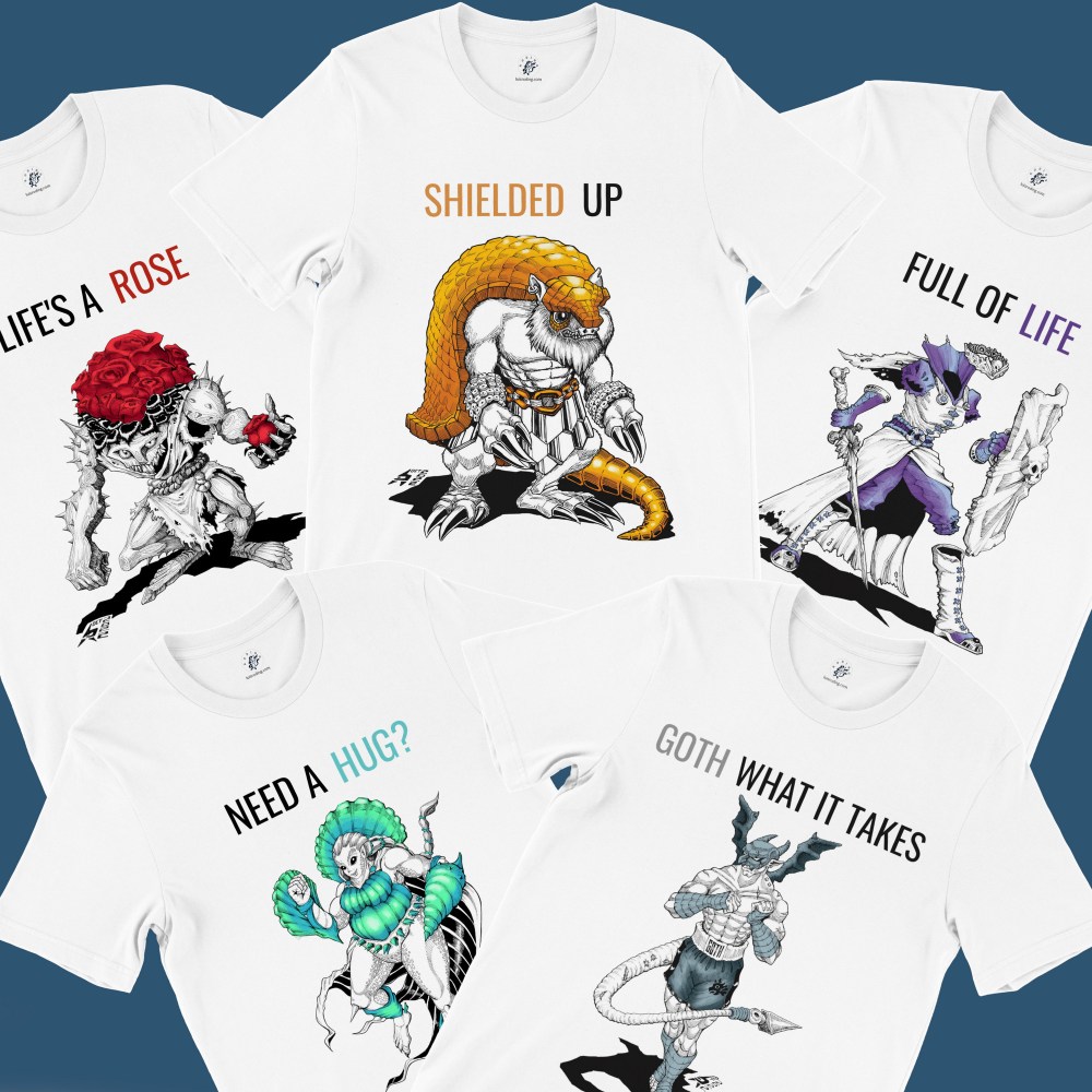 I am very excited to offer a selection of my finest entries for this yearly challenge on printed crew-neck t-shirts, now with color and a mood-busting phrase!