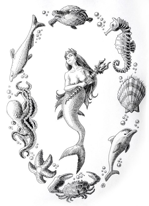 The mysterious Mermaid with sea creatures dancing around engraved on Don Angelo’s mysterious vault of wonders is finally here. It is amazing to think this illustration was born back then in 2021, when I wrote my first short story “The Tiny Paper Man”.